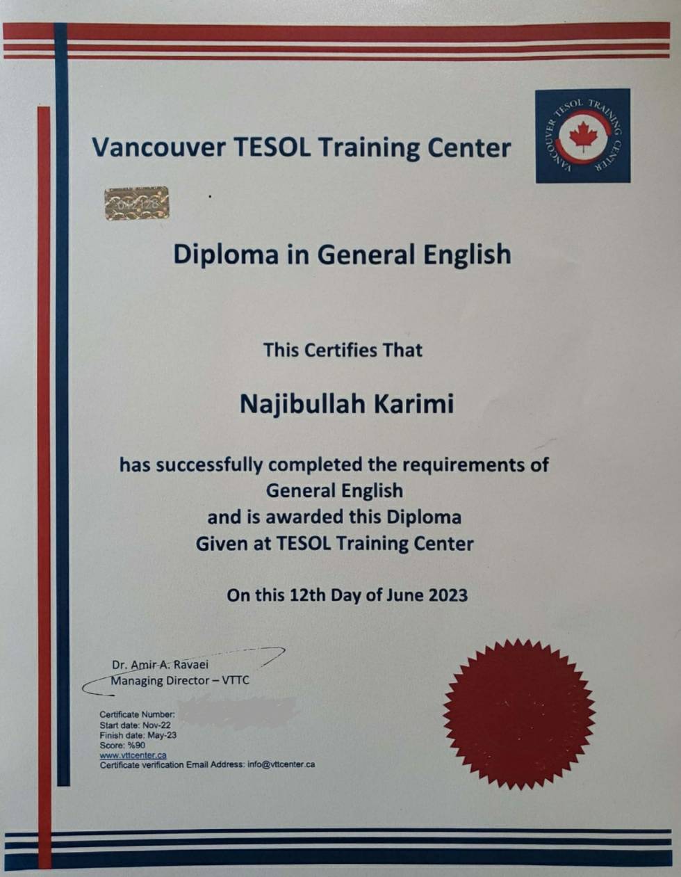 بسیار خوشحالم که من هم بهعنوان یکی از زبانآموزان این مرکز، سند تیسول ونکوور کانادا و سند شعبه تیسول در افغانستان را امروز دریافت کنم. دوره یادگیری در این مرکز برای من یکی از طلاییترین دورههای آموزشی/تحصیلی بود. تا جاییکه امروزه دید من نسبت به جهان و موضوعات مهم آن تغییر کرده و یک جهان بزرگ و مملو از فرصتها، زیباییها، ارتباطات و کار و تلاش را به تماشا نشستهام.